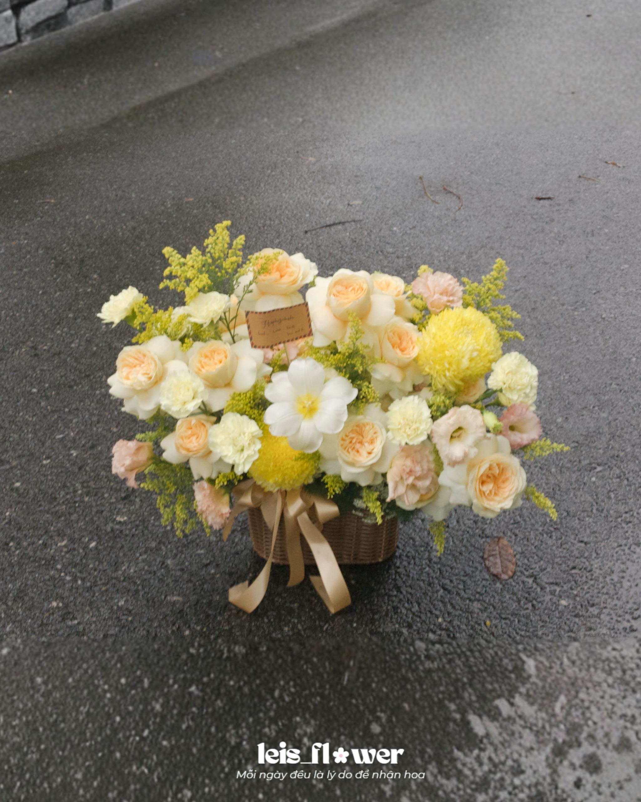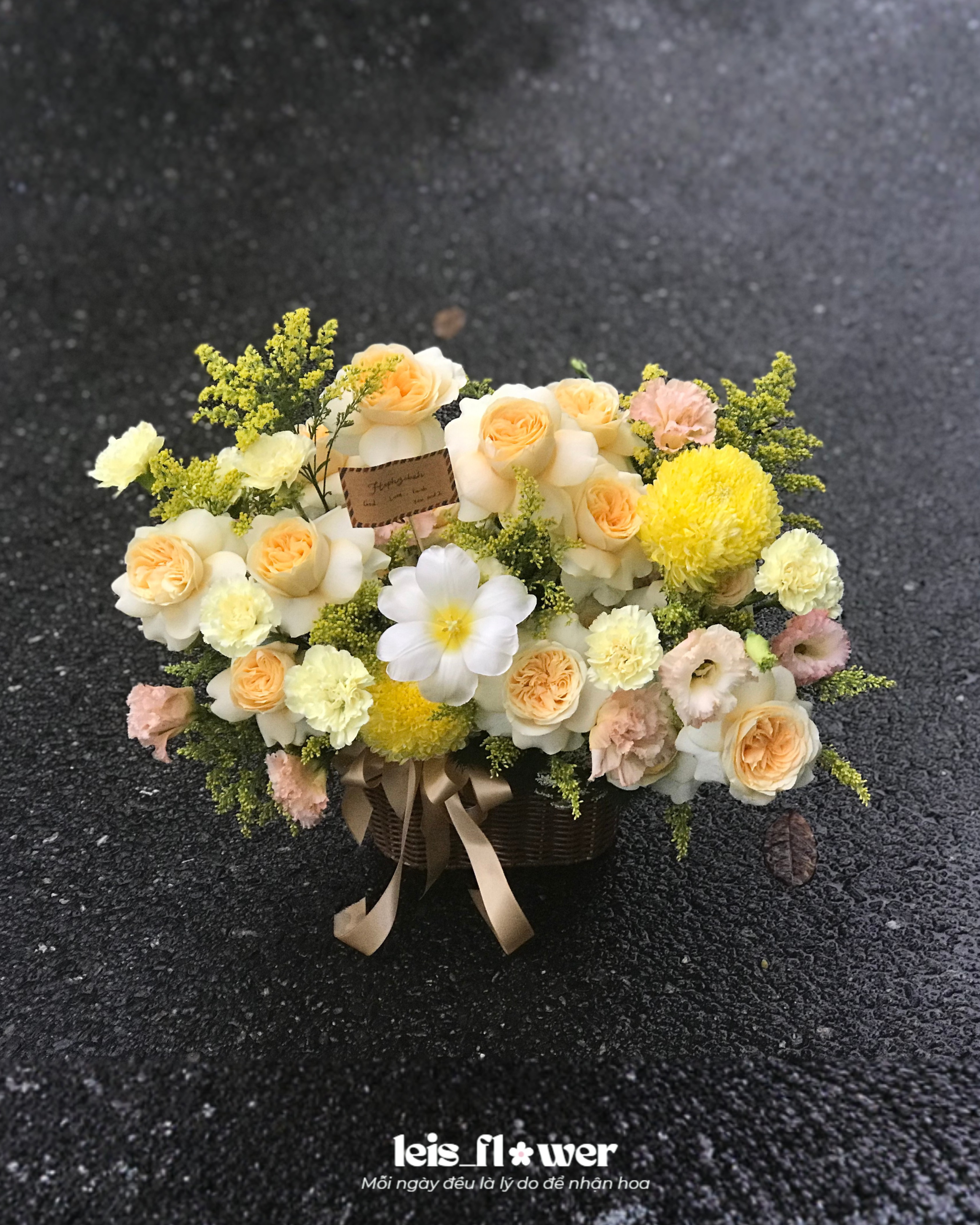 Giỏ hoa tone vàng rực rỡ, được phối từ nhiều sắc độ vàng – từ vàng tươi, vàng ấm đến vàng cam nhẹ – tạo nên cảm giác ấm áp, sang trọng và đầy năng lượng tích cực.