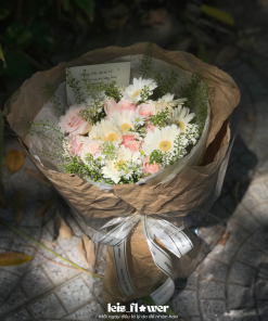 Một thiết kế mang vẻ đẹp mộc mạc và thơ mộng, gói ghém những cảm xúc chân thành nhất dành tặng người nhận. Sự hòa quyện giữa sắc hồng kem dâu thanh thoát và đồng tiền nhí trắng tinh khôi tạo nên một tổng thể trong trẻo, nhẹ nhàng. Bó hoa tựa như một “góc nhỏ” an yên, giúp gửi trao lời hỏi thăm hay đơn giản là mang lại một nụ cười mà không cần chờ đợi dịp đặc biệt.