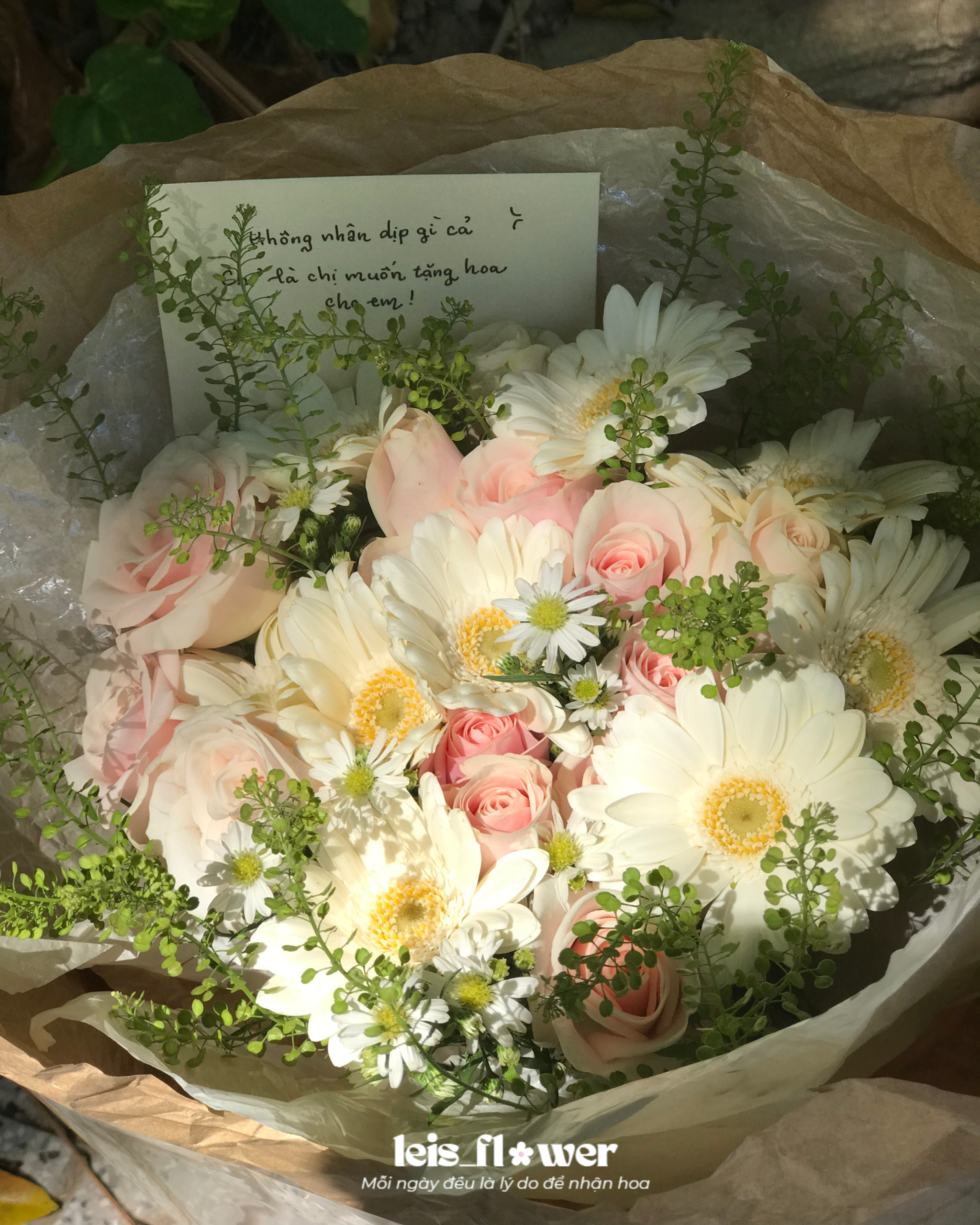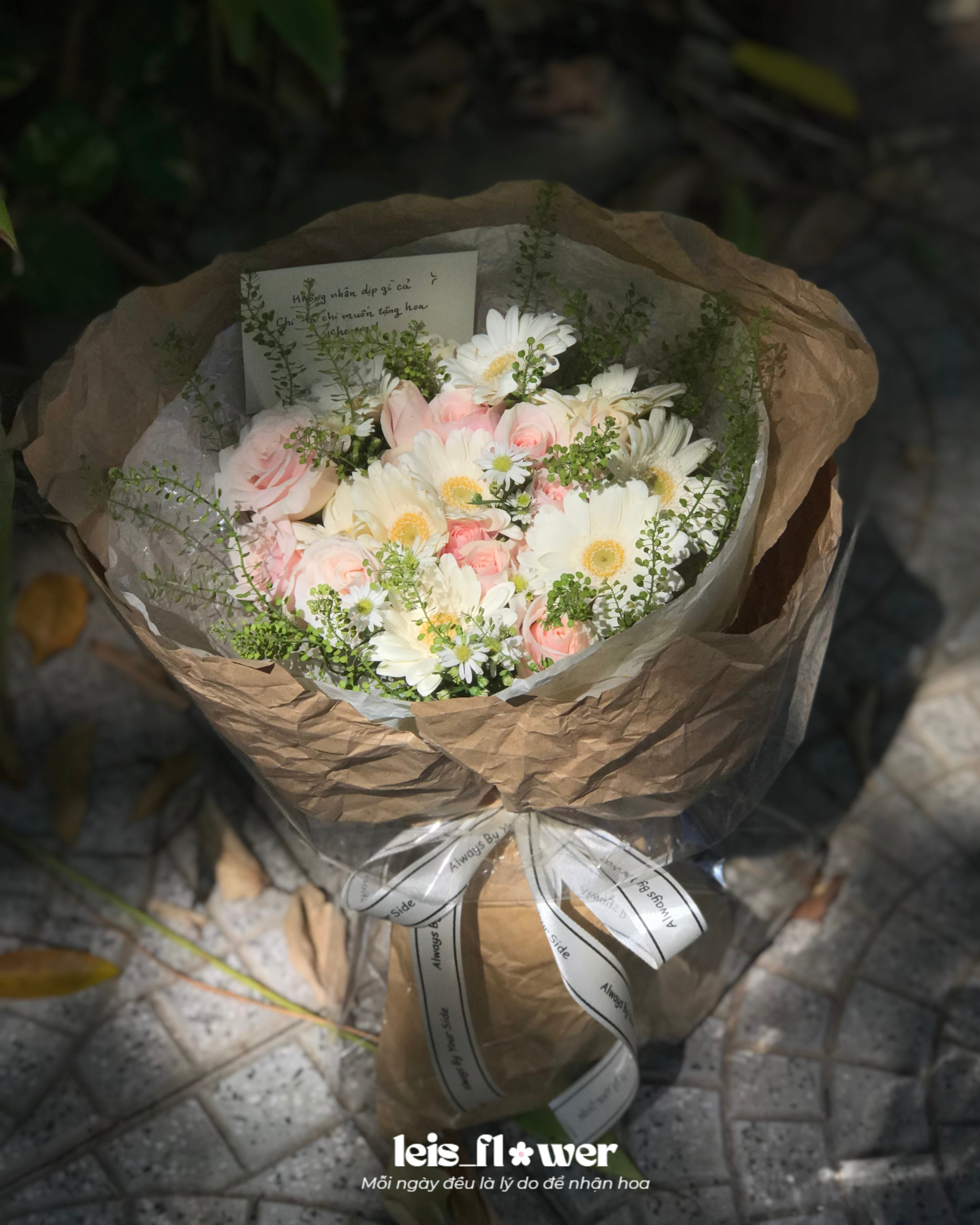 • Hoa phối: Hoa đồng tiền nhí trắng (Tinh khôi, dễ thương) và lá phụ theo mùa.